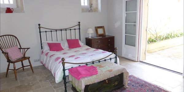 A generous room opening directly onto the courtyard garden, bringing light and ease to the space. A comfortable sofa creates a relaxed seating area, and the en suite bathroom includes a walk-in shower. Positioned on the ground floor, it offers straightforward access for guests who prefer to avoid stairs.
